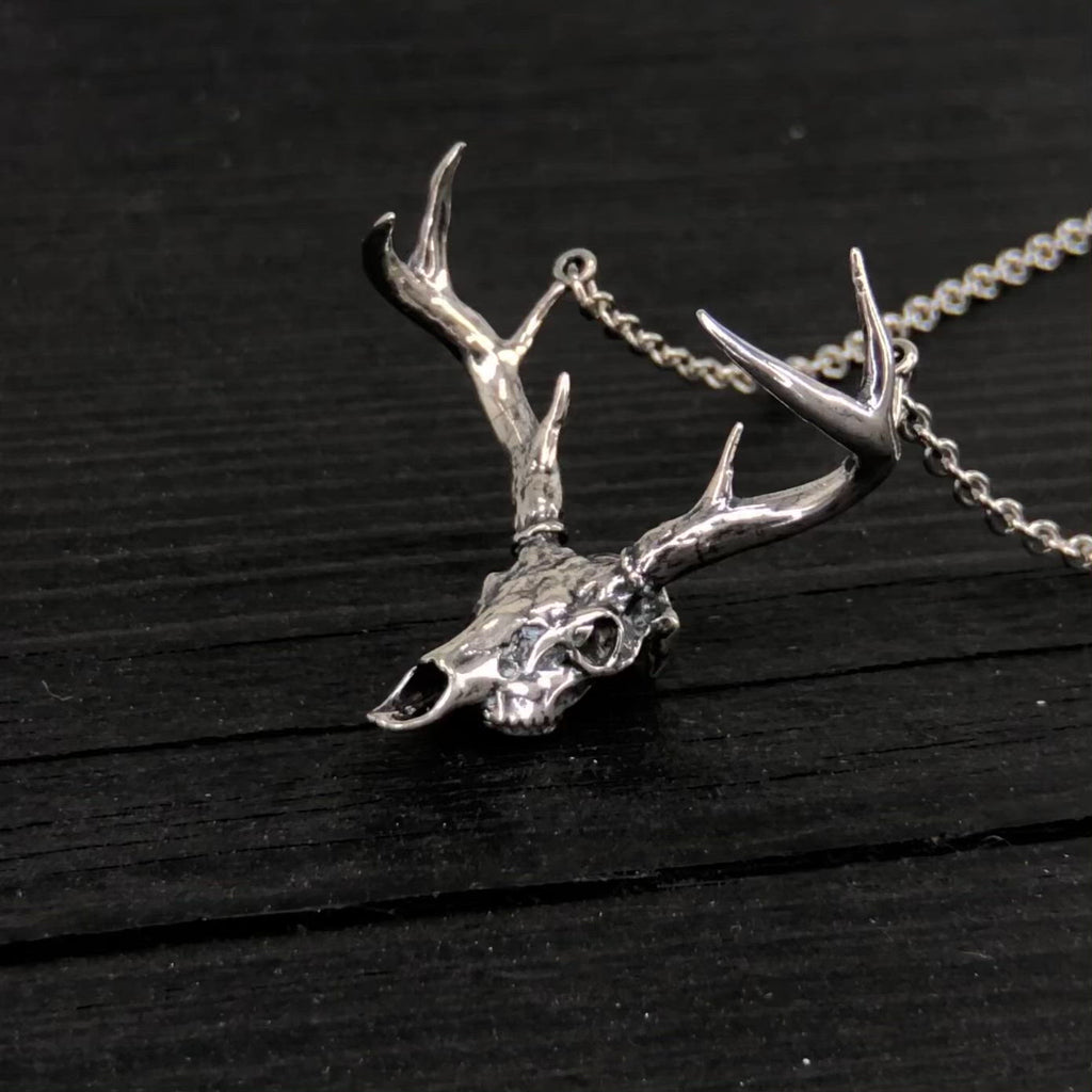 Sterling Silver Whitetail Deer Skull Antler Rack Pendant Necklace - Solid Hand Cast 925 Sterling Silver - Unisex - Multiple Chain Lengths