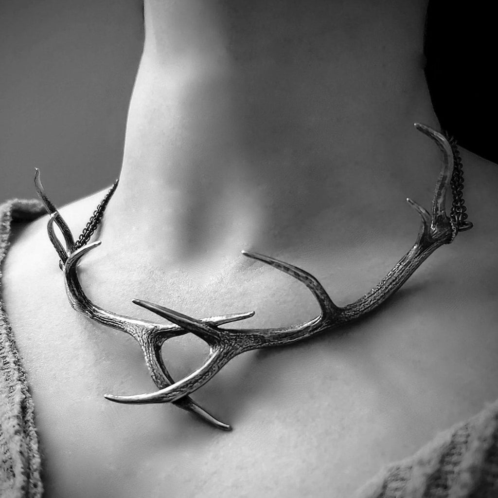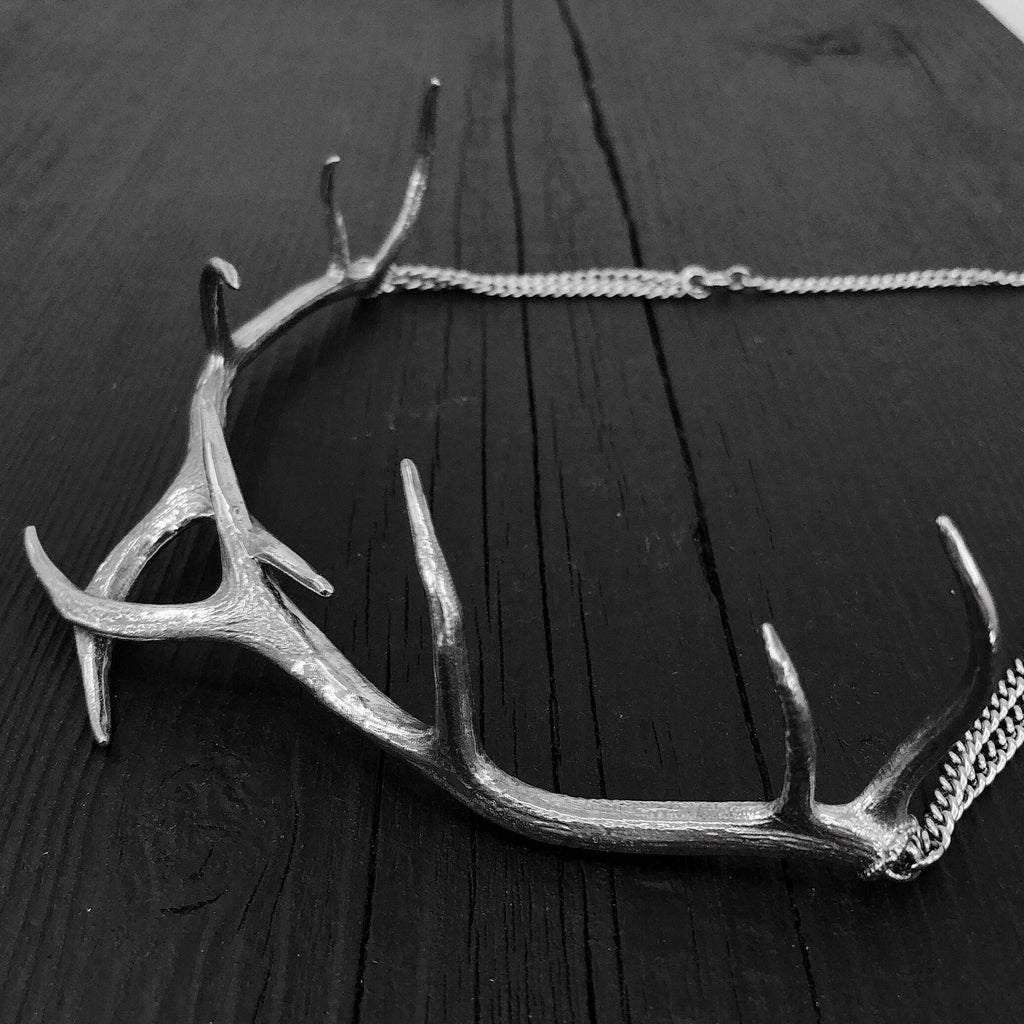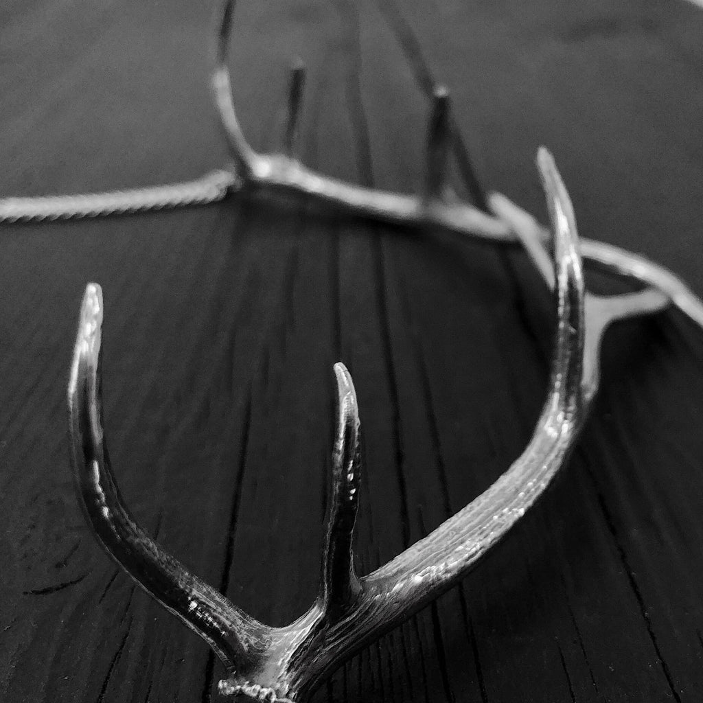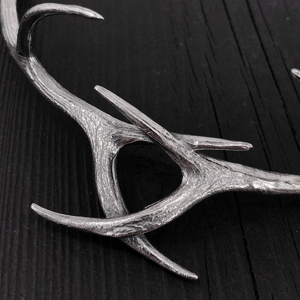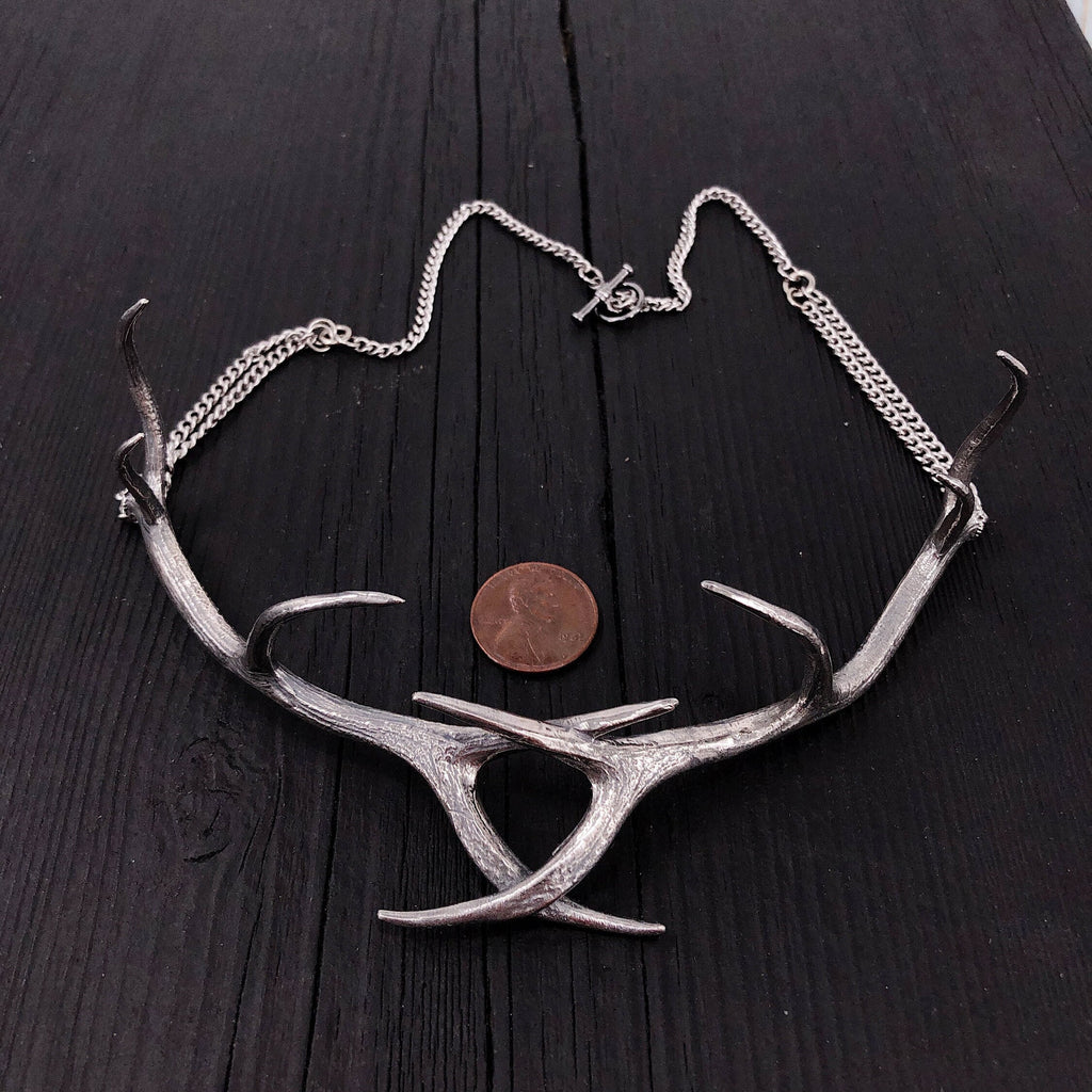 I have crossed two of my massive elk antlers and cast them into one solid sterling silver choker that will surely be the hit of the occasion. The finished piece is a combination of primal elegance and high fashion. The Antlers are textured on both sides and it is finished with matching chains and findings. The Antlers measure 5-3/4" x 2-1/4" with an overall end to end length of 18".