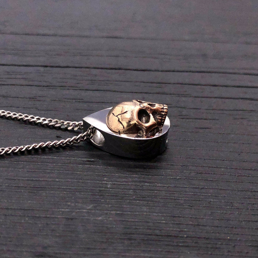My cremation urn pendant is made of hypoallergenic stainless steel with a mirror finish. Mounted on the front is a detailed bronze human skull. A discreetly placed screw can be removed from the bottom revealing a small chamber that will contain a small amount of cremated ashes of a departed love one that you wish to eternally keep close to you. After filling, the chamber can be permanently sealed by applying "lock-tight" or nail polish to the threads before closing. This little urn necklace measures 7/16"(13mm) wide and 3/4"(18mm) tall.