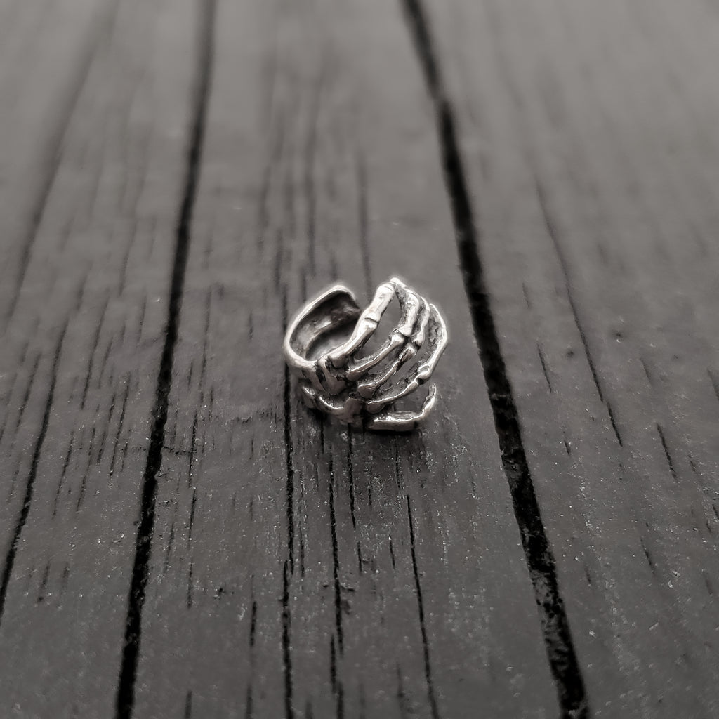 The Skeleton Hand Ear Cuff Sterling Silver is a striking sterling silver ear cuff designed to deliver a bold statement and unique style. This sterling silver ear cuff measures 3/8" and features an intricately hand cast silver skeleton hand design that wraps comfortably around your ear, offering an adjustable ear cuff fit for all-day wear. Crafted by Moon Raven Designs, this solid silver cuff combines macabre jewelry aesthetics with mythic style earring elements to create a one-of-a-kind statement ear accessory that stands out in any collection.