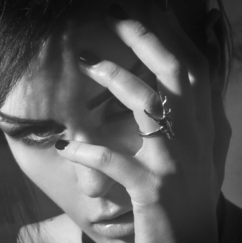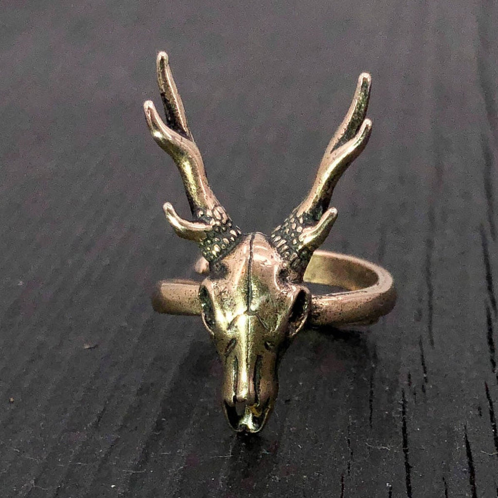 This stunning little stag skull ring is cast in solid jewelers grade. It is 1-1/2" long overall by 13/16" across at the widest point of the antlers. It is extremely well detailed for such a dainty skull, even the nasal cavities are sculptured. The solid symmetrical antlers have six points and are realistically textured all around their bases. The low profile of the skull allows it to lay close to the finger making it easy to wear while looking amazing at the same time