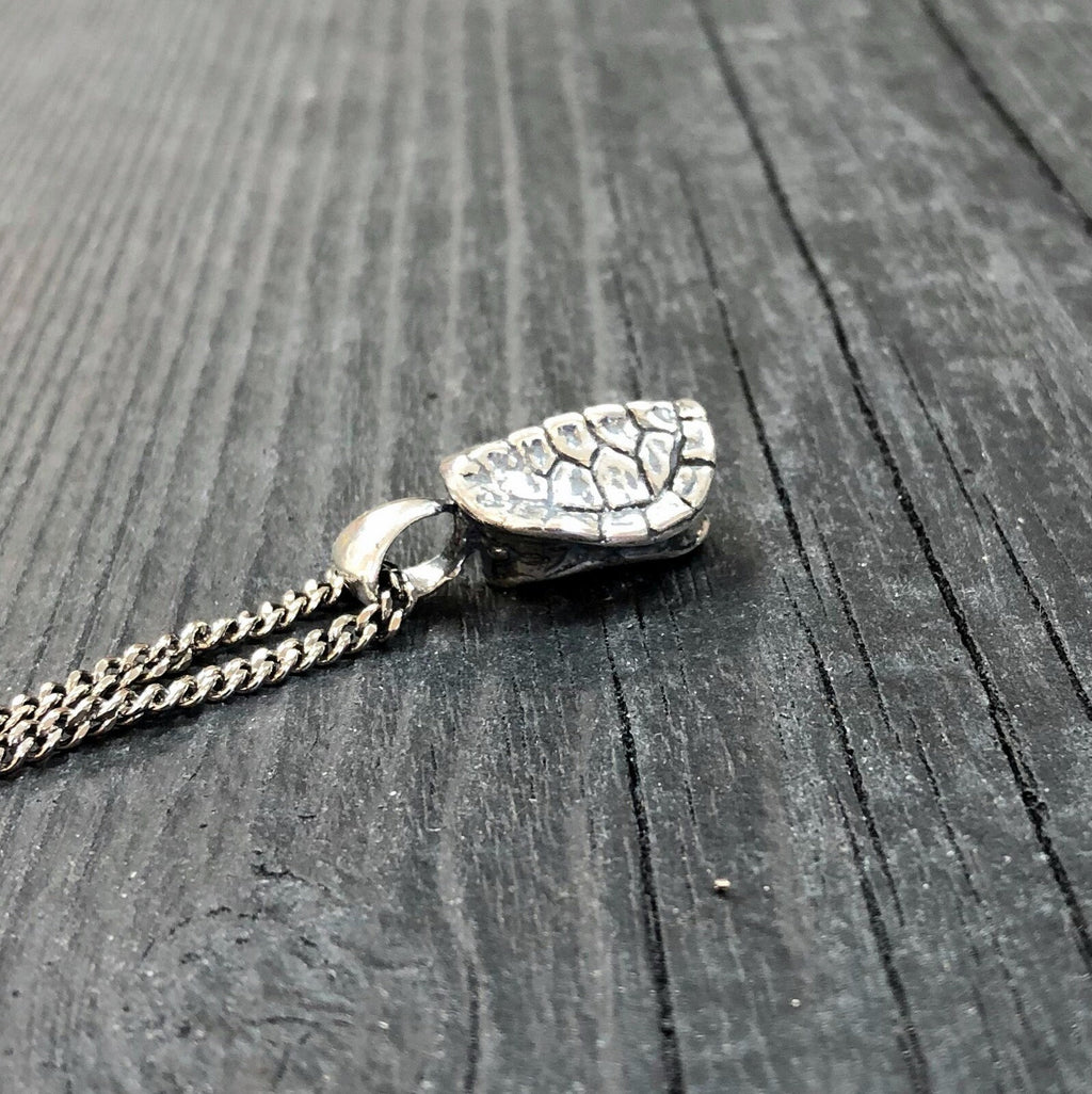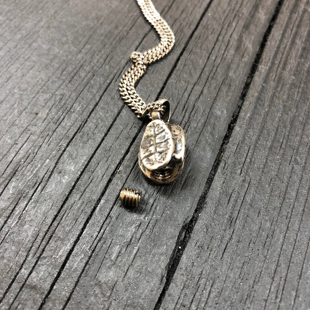 This beautiful turtle shell pendant is actually a unique cremation vial, a discreet way to stay close to the remains of your dearly departed. The shell is made of solid 925 sterling silver with an oxidized and hand polished finish to enhance the fine details. It is completely three dimensional and is 3/4" long including the fixed triangle bail. A discreetly placed screw can be removed from the bottom of the turtle shell revealing a small chamber that will contain a small amount of cremated ashes of a departed love one that you wish to eternally keep close to you. After filling, the chamber should be permanently sealed by applying "lock-tight" or nail polish to the threads before closing to prevent the screw from falling out. It will also fit your Pandora bracelet.