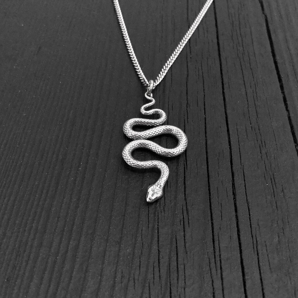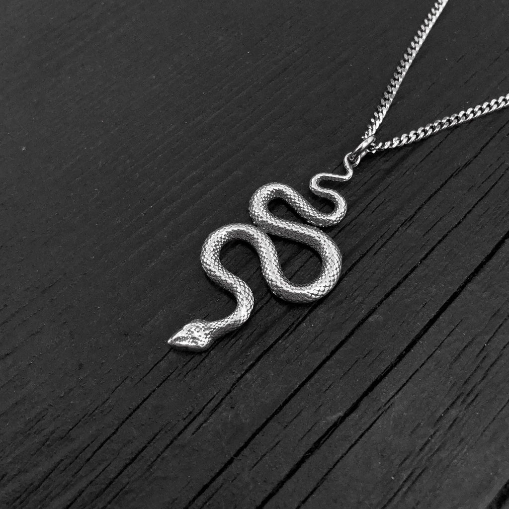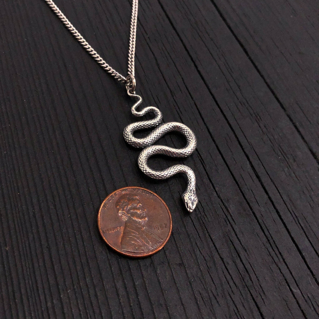 Live dangerously with this little sterling silver viper hanging around your neck. The realistic scale detail is amazing and has been enhanced with a slight oxidization treatment. The head is realistically defined and the natural look of the body coils are well executed. The chain passes through a bail trapped in the snakes tail coil.