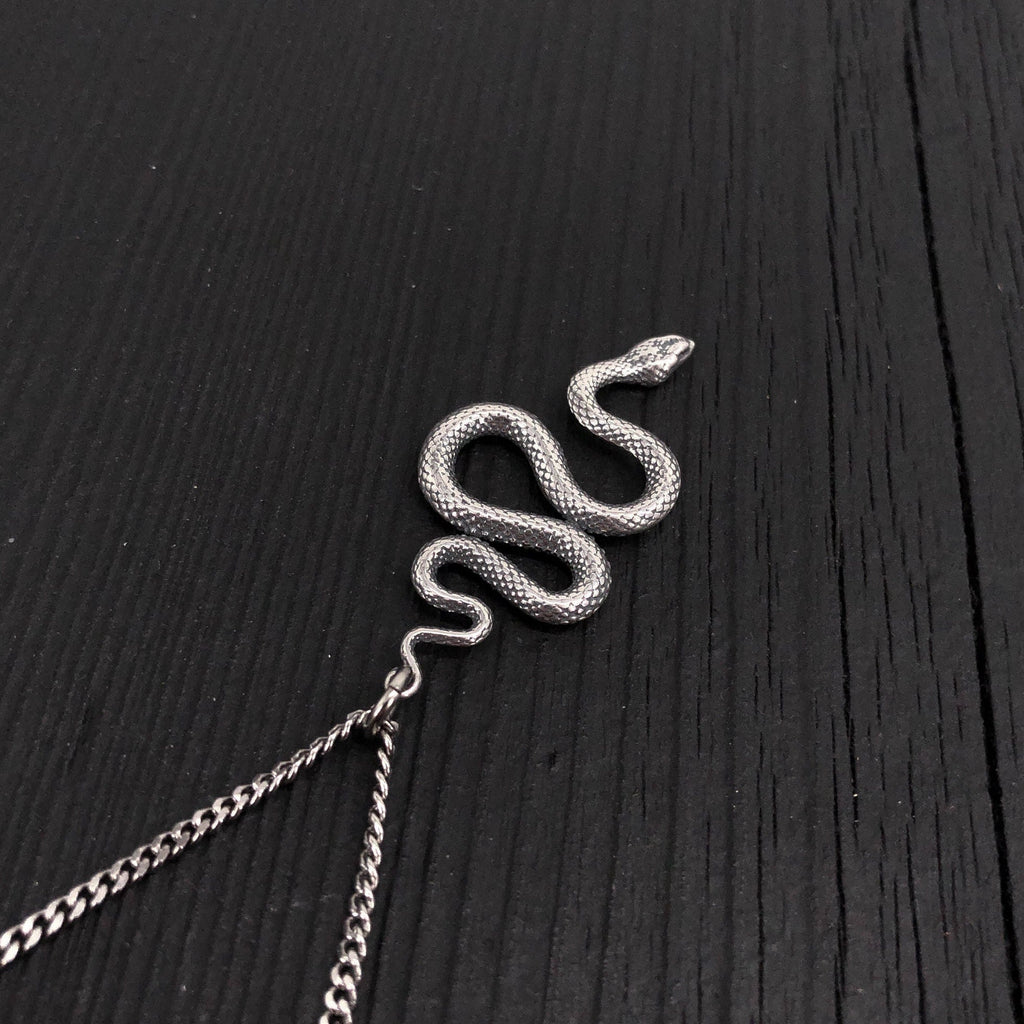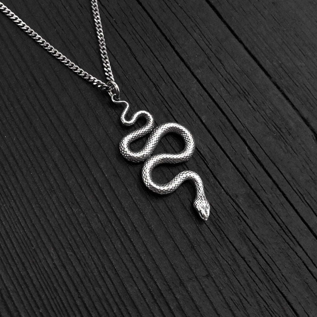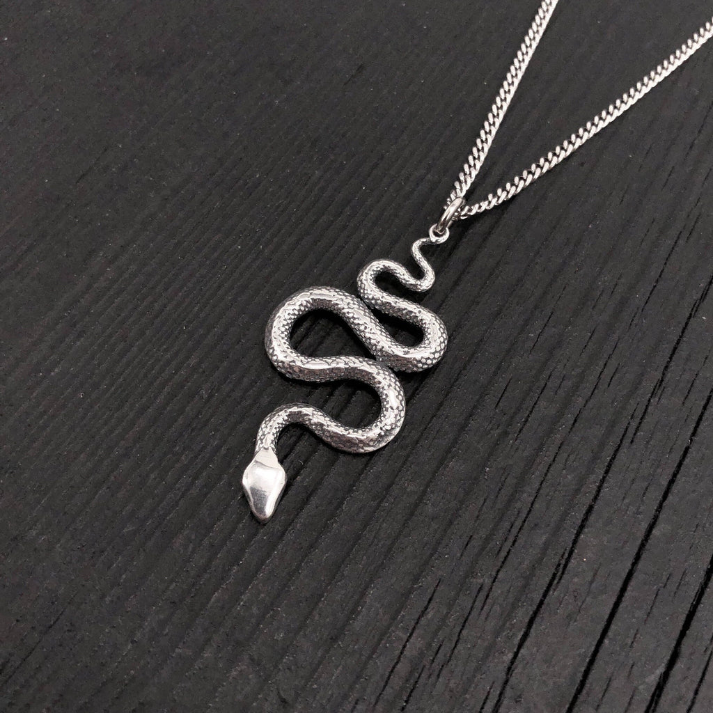 Live dangerously with this little sterling silver viper hanging around your neck. The realistic scale detail is amazing and has been enhanced with a slight oxidization treatment. The head is realistically defined and the natural look of the body coils are well executed. The chain passes through a bail trapped in the snakes tail coil.