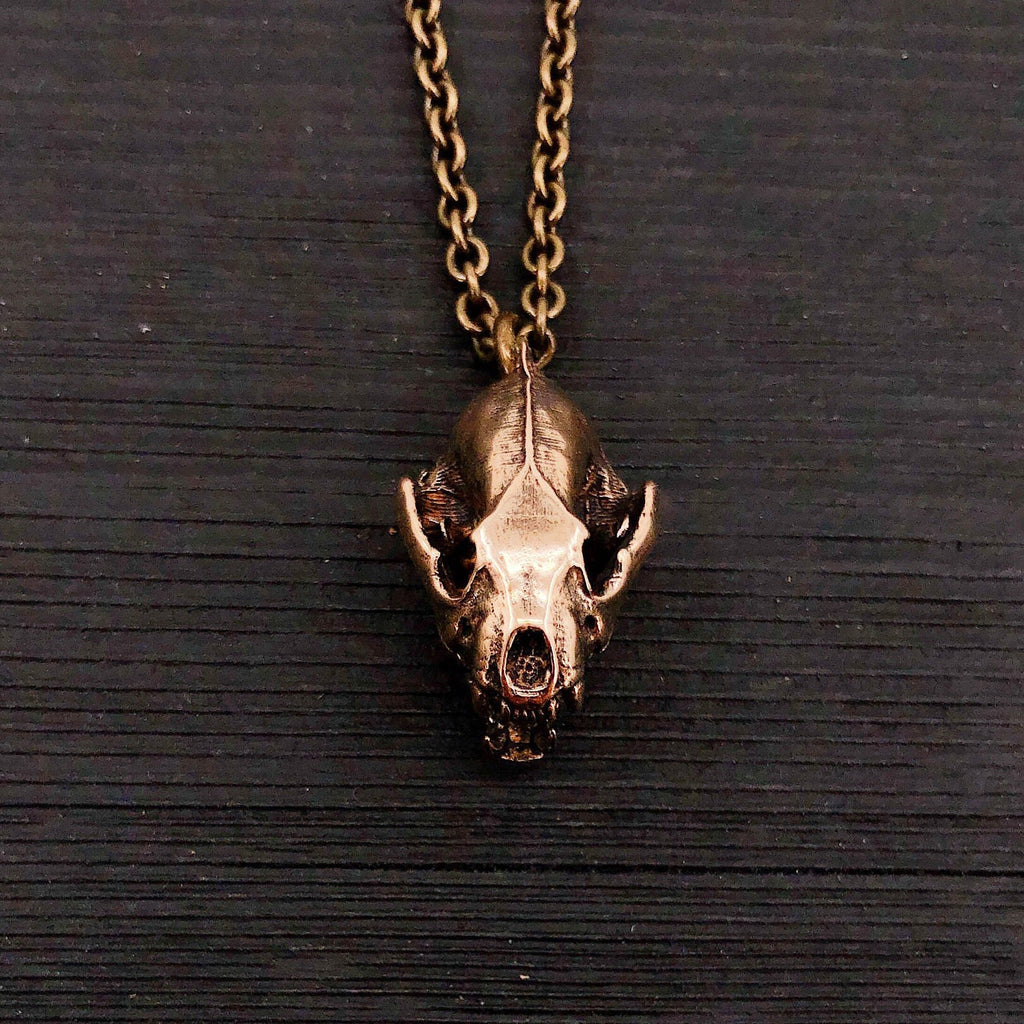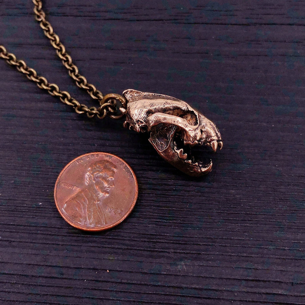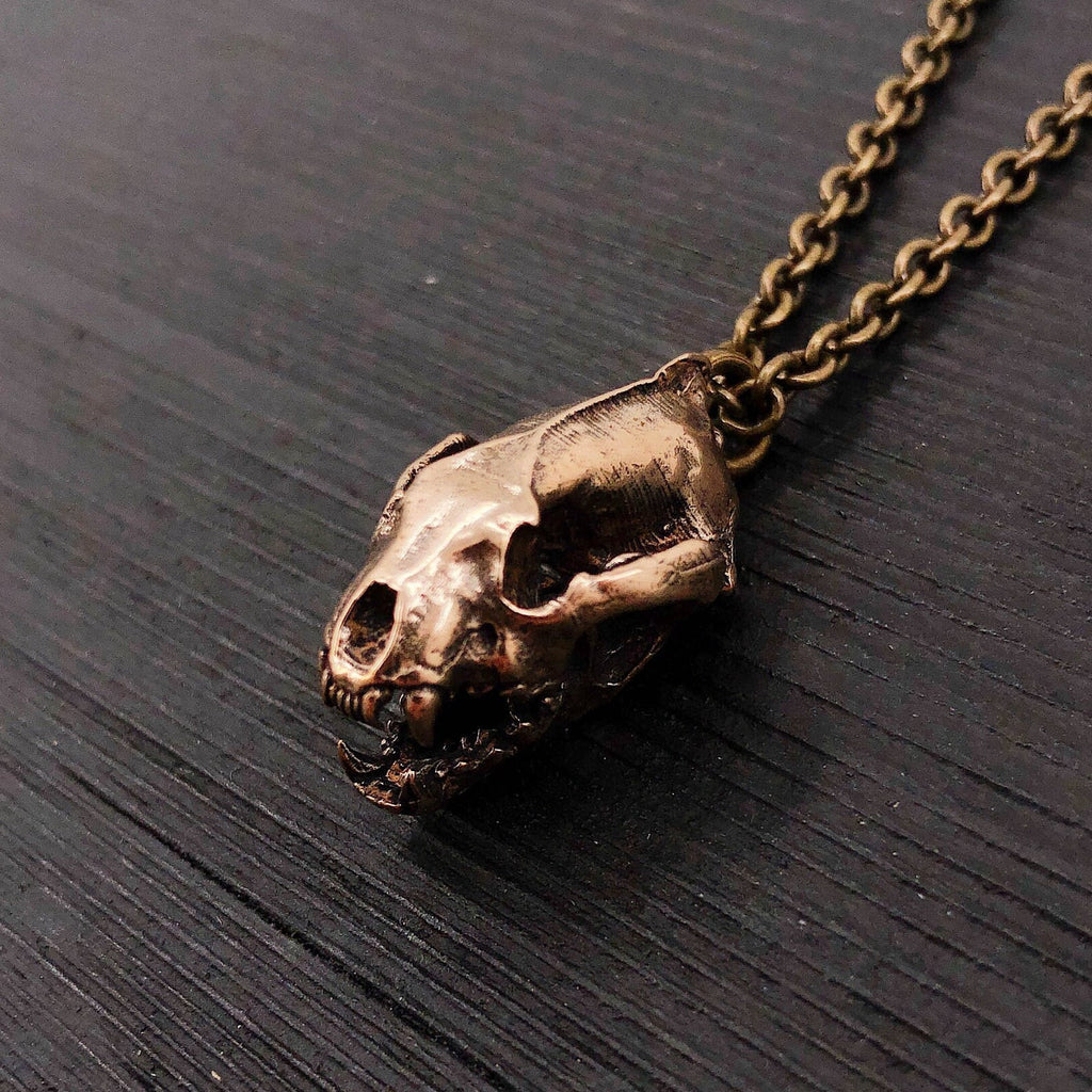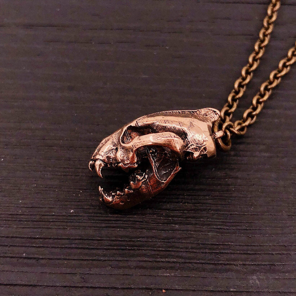 This hand carved wolverine skull pendant exhibits exceptional realistic detail with the jaw slightly ajar revealing excellent tooth detail. It is cast in solid bronze with a bright hand rubbed finish that accentuates every unique detail. The perfect gift for someone that loves and admires this fearsome animal.